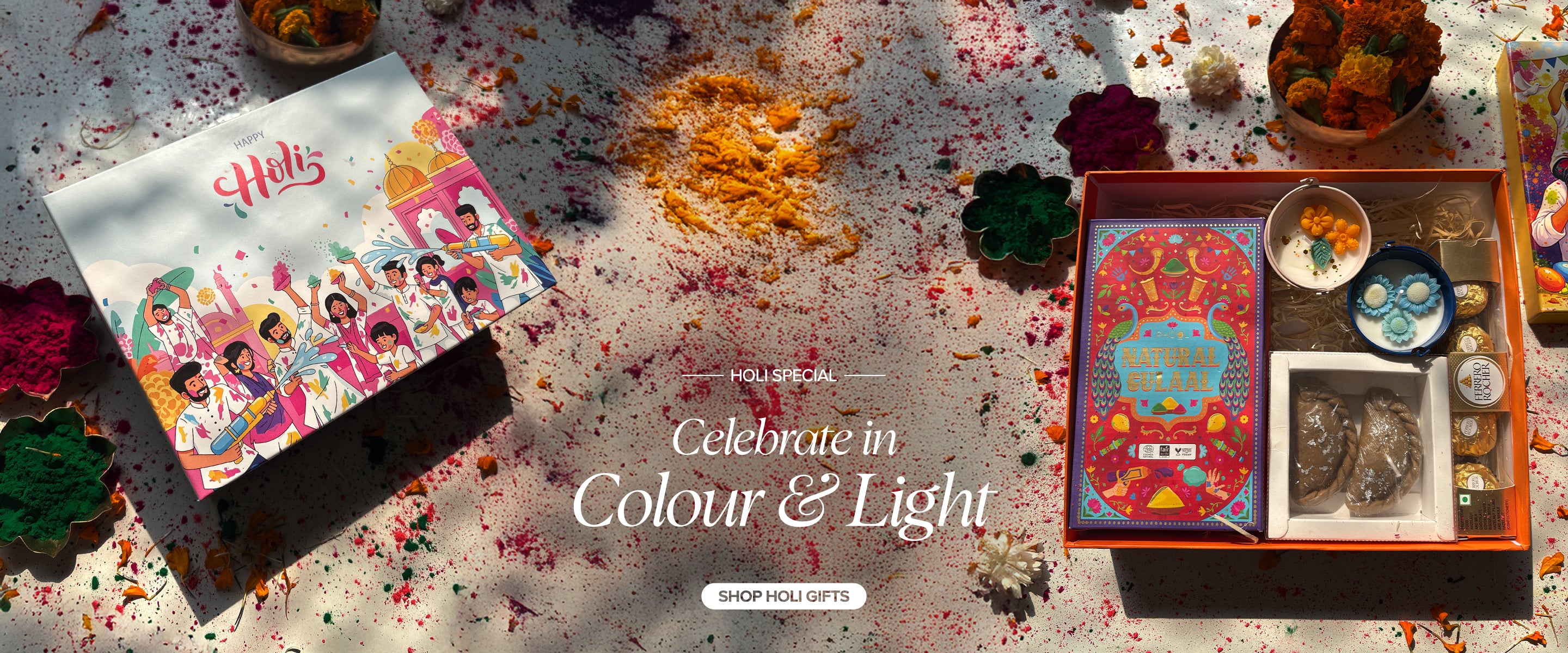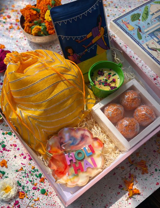 Premium Holi Hamper Box – Phool Gulal,Scented Candles & Chocolate