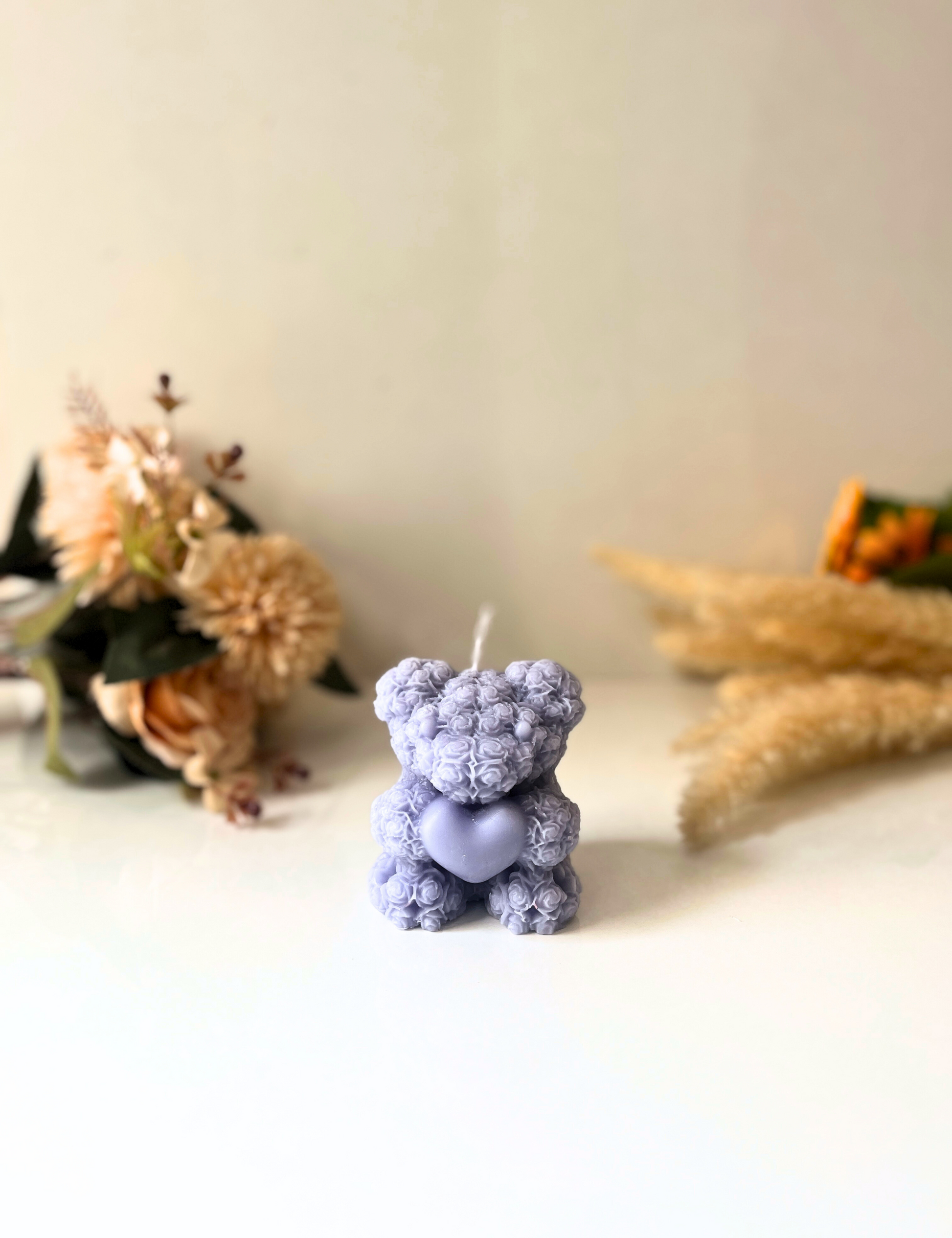 A stunning handcrafted candle designed in the shape of a teddy bear, covered with delicate little roses. This elegant and unique piece adds a touch of charm and sophistication to any space. Perfect for home décor, romantic settings, or as a thoughtful gift for your loved ones. Made with high-quality wax for a clean and long-lasting burn, this candle is a beautiful blend of art and warmth.